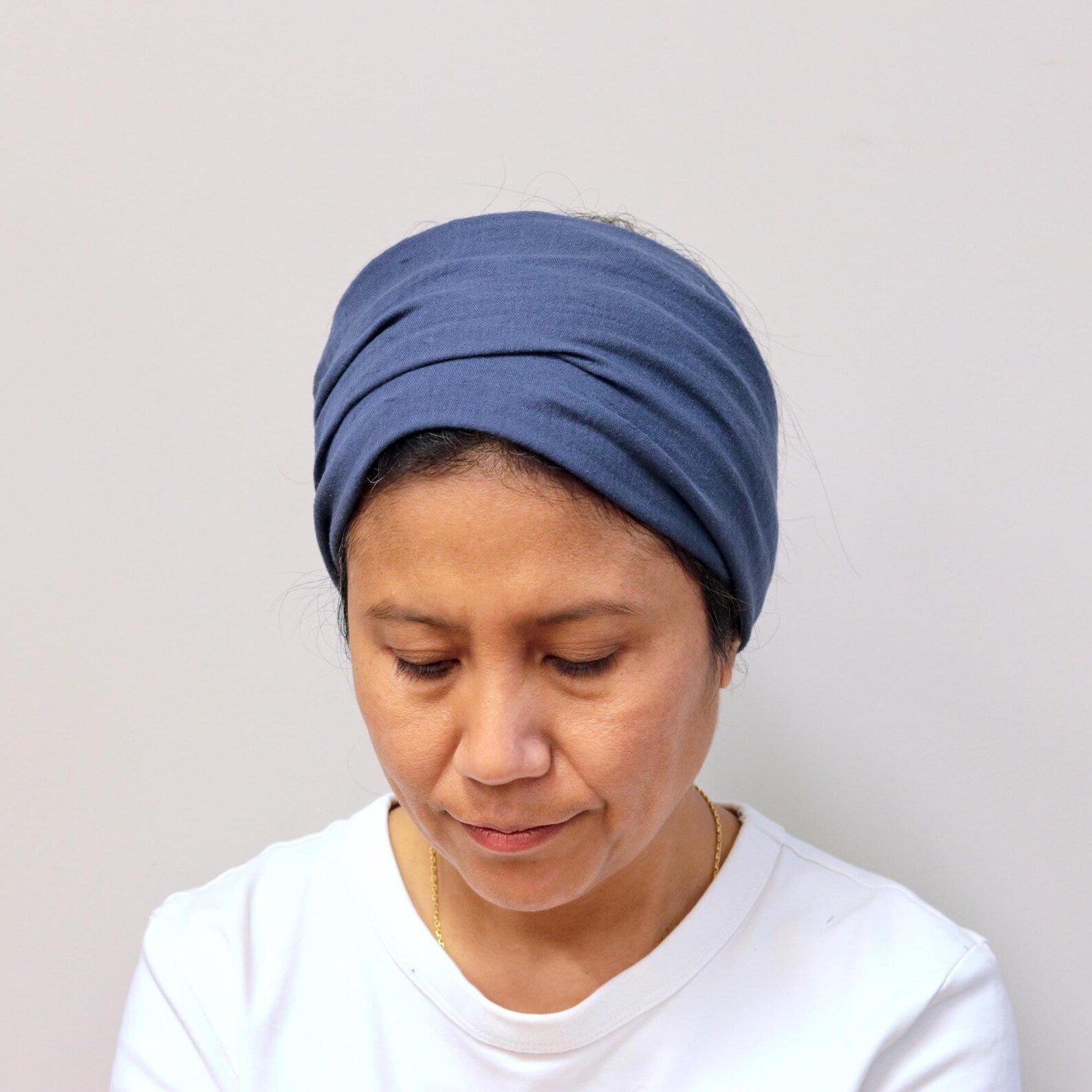 Expertly crafted muslin headband featuring two-layer construction with seamless finishing. Precisely dimensioned at 14 cm (5.5 inches) width at its broadest point, with 53 cm (19.7 inch) relaxed circumference. Reference model wears with 56 cm (22 inch) head circumference for optimal fit assessment.