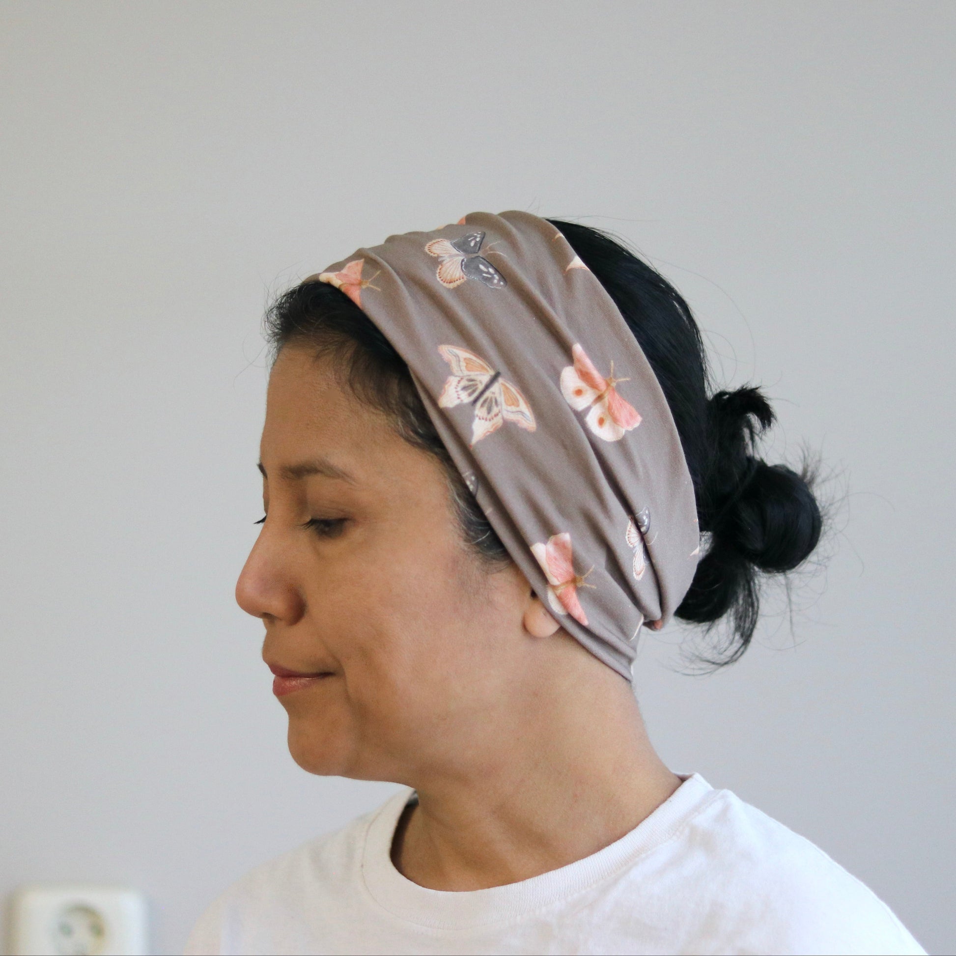 Crafted from soft organic jersey cotton, this double-layer wide headband features an elegant taupe background adorned with delicate butterfly prints. Its breathable, sustainable fabric ensures comfort and gentle wear, making it ideal for all-day use. The double-layer design offers added durability and a secure fit, blending style with functionality for a refined accessory choice.